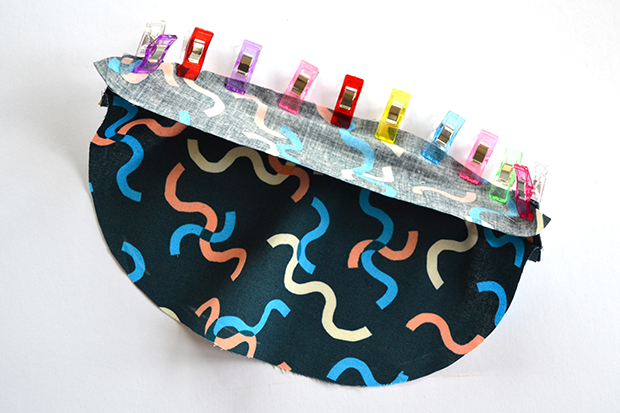 10. Now lay piece A on top, face-down and clip so its curved edge lines up with that of piece C (make sure its straight edge is parallel with the straight edges of the other pieces). Starting 1cm from the top of piece A and also stopping 1cm from the top of that piece, sew along the curved edge with a 1cm seam.